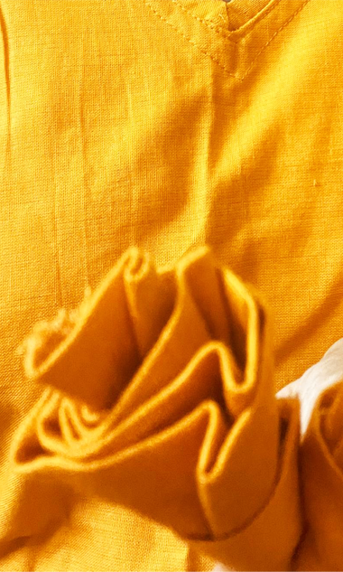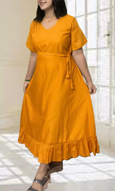 Cotton fabric, With lining, V neck design, Above ankle length dress, sleeve above elbow with slight bell sleeves, Hip knot with rose latkan, Casual wear, Feel free whole day, Soft feel, Also use as outfit, Color may vary as compared to the picture, Please purchase only if you can accept this, The actual color may differ depending on the dye lot and the display environment you are using.